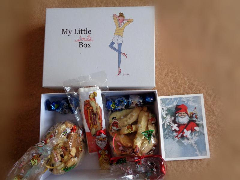 Dans une jolie boîte ... une carte bien sympathique, des chocolats, du pain d'épices et des spritz "maison" ! merci Martine. Nous avons déjà goûté, c'est très très bon !