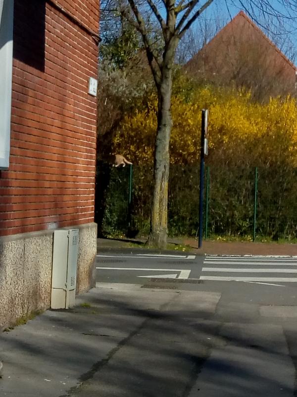 Ce matin, en allant pour une prise de sang, j'ai rencontré ce chat acrobate, qui m'a fait un demi-tour sur le haut du grillage du collège !!!