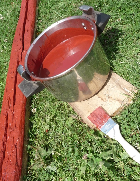 Quand cà commence à chauffer on rajoute 3l d'eau Au bout de 15 à 20 mns on obtient comme une béchamelle On ajoute 600 grs de pigments naturels en magasins décos ( chez leclerc par exemple)... 300 ml d'huile de lin Portez de nouveau à ébulition Laisser refroidir