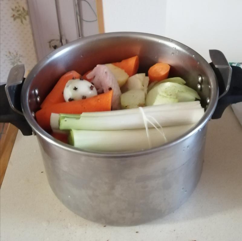 Alors une bonne poule au pot pour demain.. Et un bon bouillon pour ce soir..je n'ai pas lésiné sur les légumes :carottes, navets, chou rave, poireau, chou, et céleri boule !!! Sans oublier l'oignon pique de clous de girofles..je vais me régaler.. J'accompagneraiune petite sauce poulette.. Miam, miam..