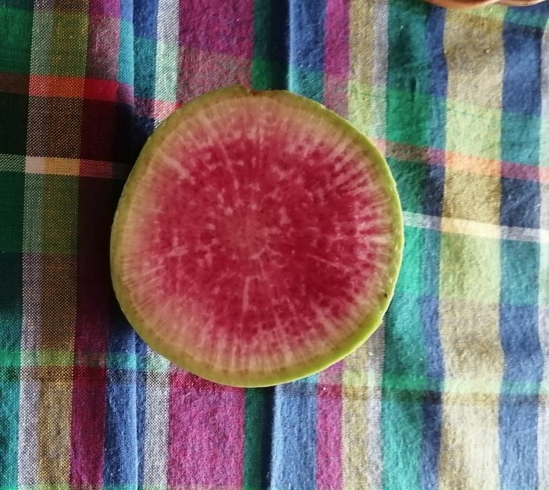 une fois copé cela ressmble a une sorte de radis ou a une sorte de betterave !!! mais tant l'un que l'autre peuvent etre mangés cuits alors .... le mystère s'épaissit !