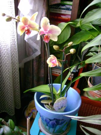J'en avais deux magnifiques depuis cinq années, et voila l'an dernier pendant mon absence elles ont été "noyées". J'ai bien essayé de les assècher mais il était trop tard . Je m'en suis offert une à 9,99euros chez LIDL , elle était dans ce grand vase. Je ne sais si elle va se plaire chez moi...L' avenir le dira .