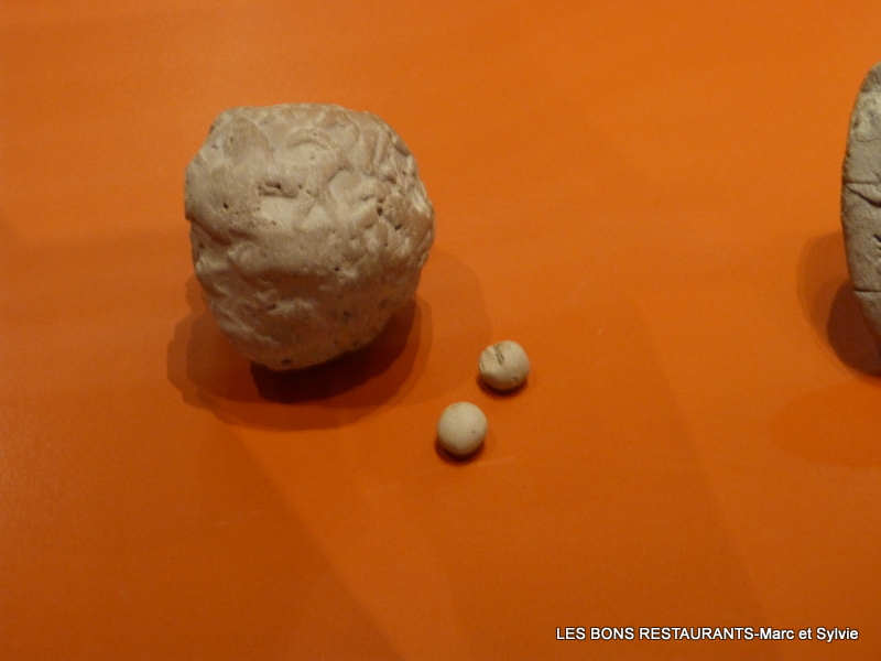 Pour enregistrer les opérations comptables, des jetons modelés dans l’argile sont utilisés. De taille et de forme différentes selon la valeur convenue, ils portent parfois des indications de nombre sous forme de traits incisés ou de dessins! À demain!
