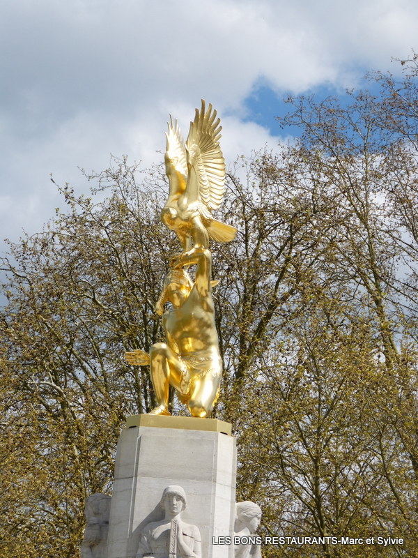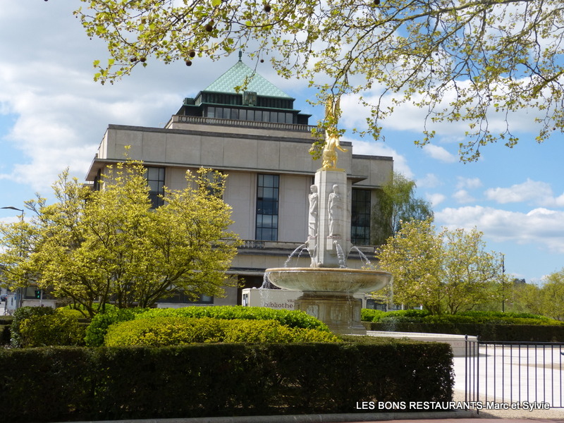 Nous rejoignons la bibliothèque devant laquelle se trouve une fontaine surmontée d'une splendide statue en bronze doré représentant les symboles de l'Amérique, un indien et un aigle.