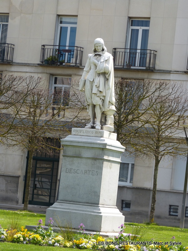 Cette statue en marbre représente René Descartes debout, la main gauche sur la poitrine, en geste d’orateur!