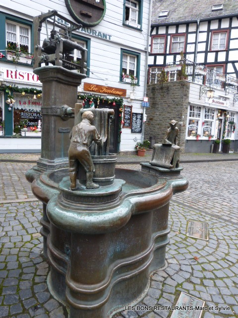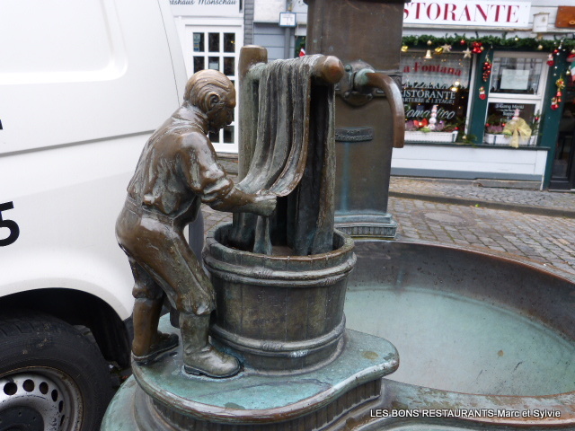 Cette belle fontaine présente le drapier, le teinturier et le tisserand. Cette fontaine illustre clairement l’essor économique d’une région grâce à la productiontextile des temps modernes.