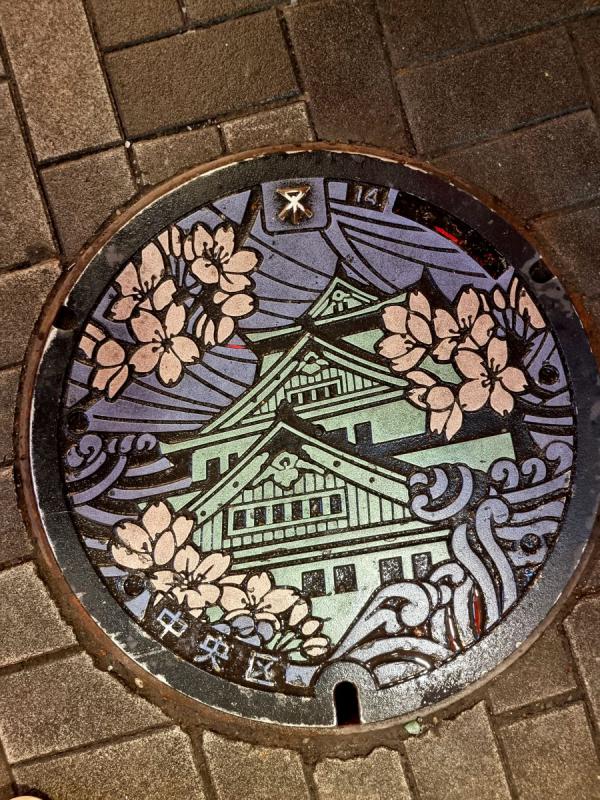 La plus célèbre de ces plaques d'égout, représentant le château d'Osaka sous les cerisiers en fleurs.