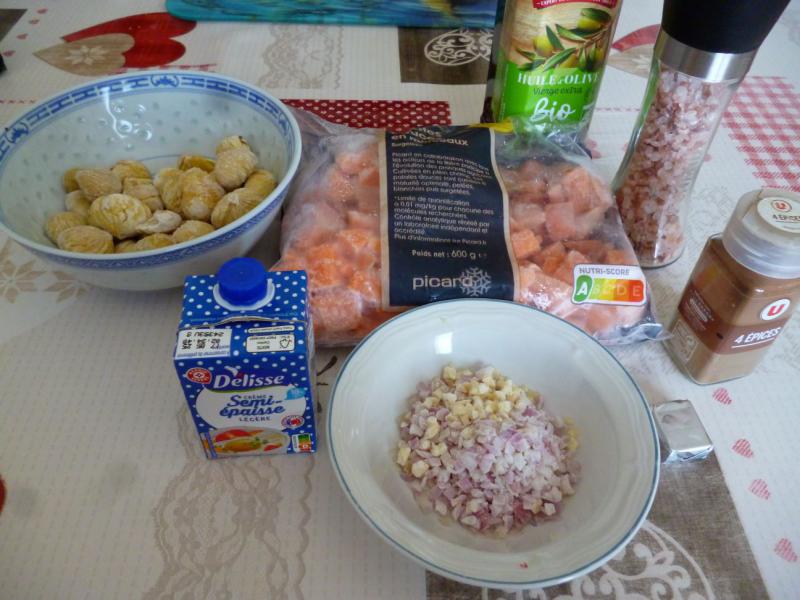 (4 personnes - préparation 20 minutes - cuisson 30 minutes) -600g de patates douces (congelées pour moi) -200g de marrons entiers (congelés pour moi) -sel, 4 épices -crème fraîche -échalote, ail, huile d'olive, ciboulette -beurre -1 bouillon cube Pelez, lavez et hachez échalote et ail.