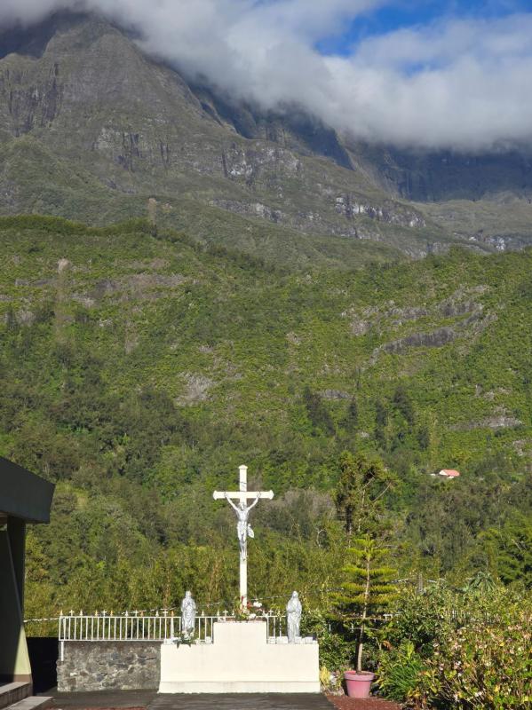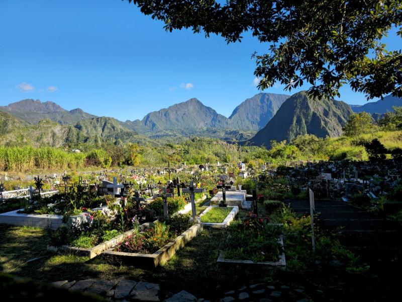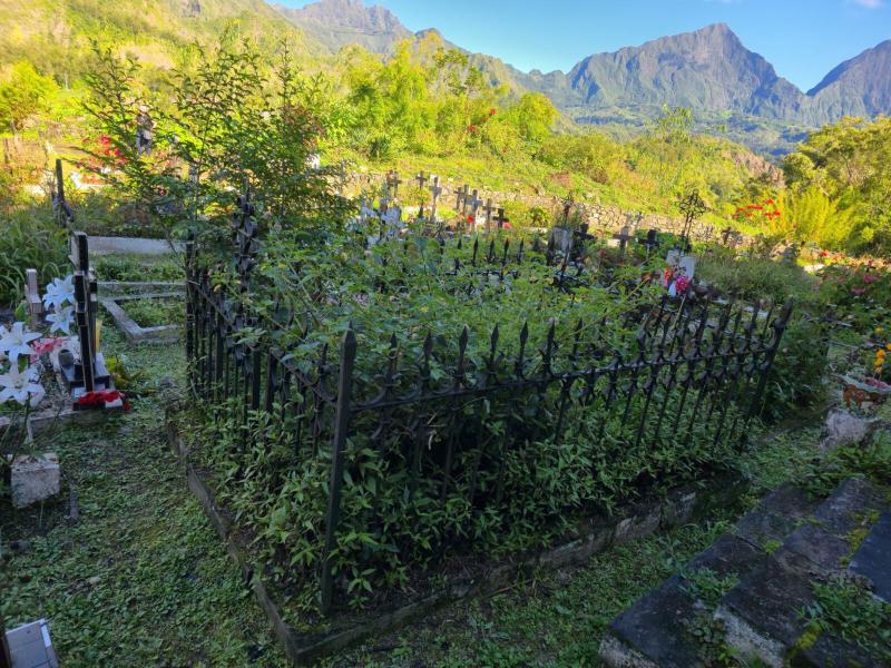 Volcenay Zitte se trouve être un célèbre bandit sanguinaire, qui a terrorisé les Réunionnais en 1919. Il sévit dans les hauts de Saint-Paul, à la Possession et à Saint-Denis, en s’introduisant dans des cases pour voler. On lui prête de graves méfaits, dont des viols et assassinats. Le fugitif est finalement arrêté chez sa sœur à Marla dans le cirque de Mafate. Un guet-apens a été tendu mais Volcenay Zitte ne sera pas ramené vivant. Durant le trajet pour l’escorter hors du cirque, Volcenay Zitte se suicide et meurt à Grand Sable. ![]() Fleuri et pittoresque, le cimetière offre une superbe vue sur le piton d'Anchaing.