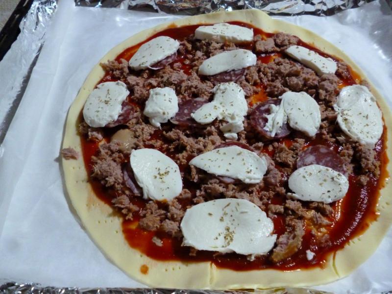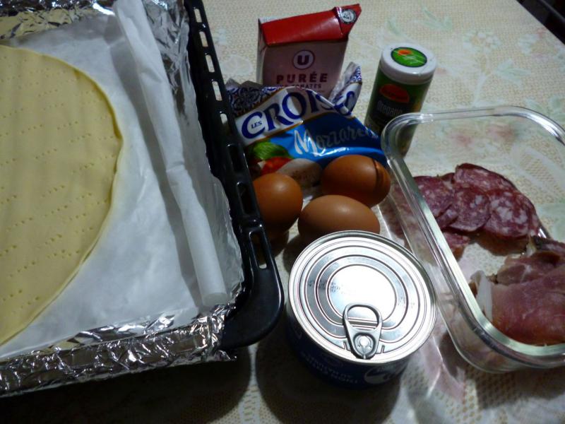(4 personnes - préparation 20 minutes - cuisson 20 minutes) -1 pâte à pizza -quelques tranches de saucisson et de jambon de pays -une boîte de thon au naturel -3 ou 4 oeufs -1 boule de mozzarella -25cl de coulis de tomates -origan Étalez la pâte sur la plaque de cuisson garnie d'une feuille de papier alimentaire.