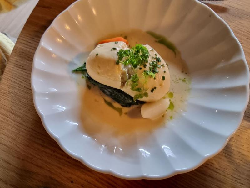 La quenelle de brochet, beurre blanc citronné perlé d'huile d'herbes fut servie sur un lit d'épinards.