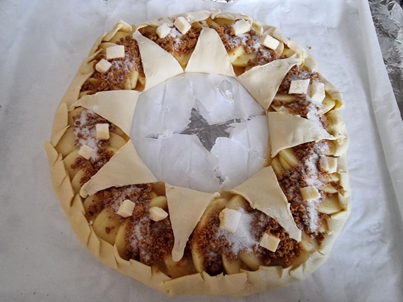 Retirez le bol au centre, puis découpez 8 parts égales dans le cercle central. Repliez délicatement chaque pointe sur les pommes. Mélangez un jaune d'oeuf avec une lichette de lait et badigeonnez-en la pâte feuilletée. Saupoudrez légèrement de sucre et mettez quelques noisettes de beurre sur la partie "pommes".