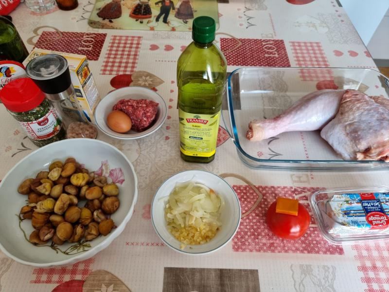 (6 personnes - préparation 30 minutes - cuisson 1h30) Farce: -200g de hachis -marrons en boîte -oignon, ail -1 oeuf -10cl de cognac -chapelure -huile Dinde: -une cuisse de dinde -beurre, huile -ail -tomate -0,5l de bouillon de volaille