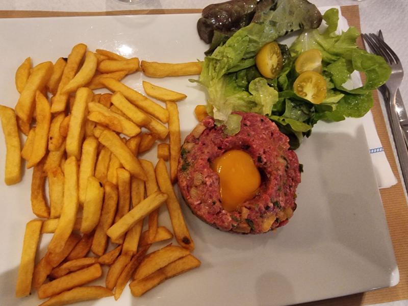 Marc décide de goûter au tartare de boeuf, lui aussi est accompagné de frites et de salade verte.
