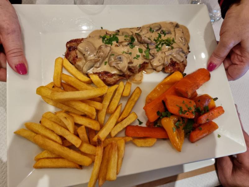 Marie-Jo se régale avec une belle escalope de veau sauce crème et champignons.