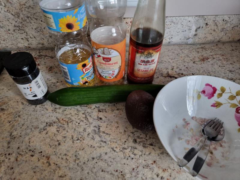 (4 personnes- préparation 15 minutes) -1 concombre -1 avocat -2 càs huile -1 càs d'huile de sésame -2 càs de vinaigre de miel -graines de sésame -ail, échalote -sel, poivre -ciboulette