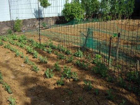 Il y a quelques temps quand les petits pois sont sotris, Marc a eu l'idée de mettre des chutes de grillage sur la ligne de petits pois pour qu'ils puissent s'accrocher.