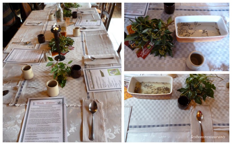 Les repas d’antan sont devenus au fil des années un moment convivial où l'on apprécie de retrouver des plats mijotés comme les faisaient nos grands mères, au goût et au parfum d’autrefois. L'année dernière, nous avons eu la chance de pouvoir participer au repas d'antan à la ferme auberge "Le domaine de Saturnin" sous le signe de "La Renaissance" (voir les deux articles sur ce lien). Cette année, nous avons participé à un repas d'antan "médiéval" toujours dans la même ferme-auberge, la ferme-auberge Le Domaine de Saturnin située 5 rue de la source à Bernécourt en Meurthe-et-Moselle. Dans le cadre de ce thème, un jongleur s'est immiscé entre deux plats pour nous jouer l'aubade ou afin de nous narrer quelques belles histoires moyenâgeuses! Dans un premier temps, je vous présenterai le repas proprement dit, puis dans l'article suivant, vous verrez notre jongleur et tous ses instruments(voir l'article de ce spectacle sur ce lien)! Cliquez sur les photos pour les agrandir! À l'époque du roi Arthur et des chevaliers de la table ronde la table est toujours garnie d'une grande nappe blanche.