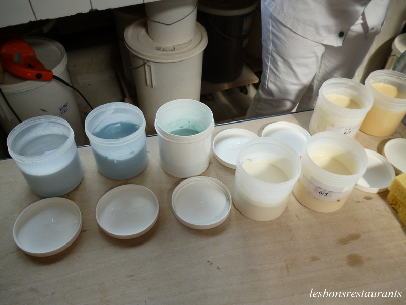 La pièce est alors retouchée puis cuite à 1050° C pendant une nuit. Il faut alors s'intéresser aux teintures qui font le renom de cette maison! C'est pourquoi, aujourd'hui, nous faisons un arrêt à l'atelier de chimie. Les Faïences et Émaux de Longwy utilisent exclusivement leurs propres couleurs qu’ils créent à partir d’oxydes dans leur laboratoire spécialisé.