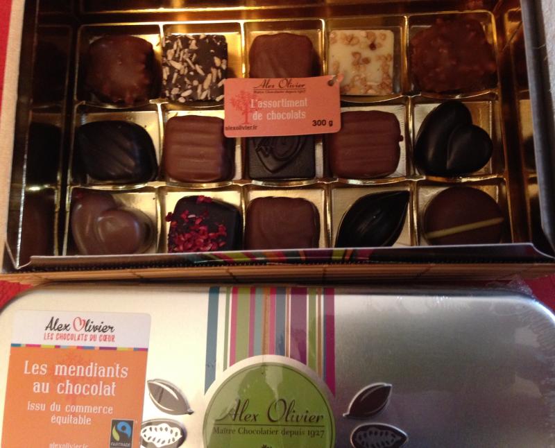 - Chocolats Alex olivier : Une sélection pour chacune de nos préférences : Assortiments pour papa/ Mendiants, nougats au chocolat et truffes pour maman// Rochers pour nicolas et pour moi uniquement chocolats au lait ou blanc. Une fabrication francaise réalisée exclusivement avec des chocolats de couverture garantis 100% pur beurre de cacao. Une gamme de chocolats issus du commerce équitable pour permettre aux petits producteurs de vivre dignement de leur travail et de prendre en main leur avenir.