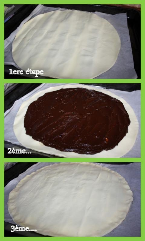 -100 g de chocolat noir -100 g de caramel au beurre salé (légèrement chauffé) -1 jaune d'œuf (pour dorer) Posez un disque de pâte feuilletée sur une plaque recouverte de papier sulfurisé. Si c'est une pâte pré-étalée, n'en modifiez pas le diamètre. Si vous l'étalez vous-même, veillez à obtenir 2 disques de même diamètre. Faites fondre le chocolat au bain-marie, mélangez-le au caramel au beurre salé, (légèrement tiédi pour le rendre moins ferme), mélangez bien ces 2 ingrédients et étalez-le uniformément sur la pâte feuilletée, en laissant vierge un pourtour de 2 cm. Humidifiez cette bordure avec de l'eau à l'aide d'un pinceau ou avec vos doigts. Couvrez avec le second disque en prenant soin de bien le juxtaposer. Soudez les bords en appuyant bien avec les doigts.