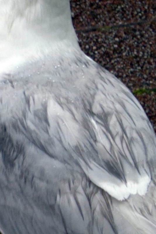 mais qu'est-ce donc ?...   alors plumes ou poils ?...   oui bien sûr vous aviez deviné... c'est le plumage d'un goéland, pris en photo ce matin sur la place. Il ne s'est dérangé qu'à peine et j'ai bien eu le temps de remarquer son très beau plumage...   |