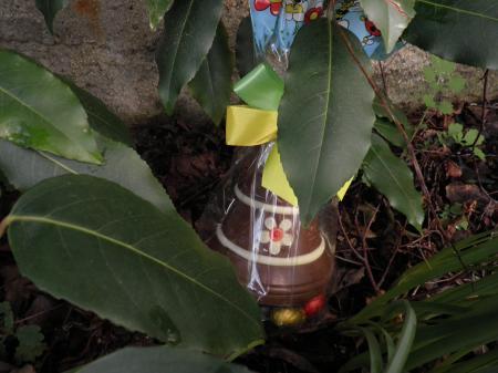 Je ne sais pas vraiment,mais le pire dans tout celà,c'est que,vu que nous partons quelques jours,nous fêtons Pâques ce soir avec les enfants.La cloche doit donc passer dans le jardin tout à l'heure et il pleut depuis ce matin!!!Aïe,aïe,aïe!!! |