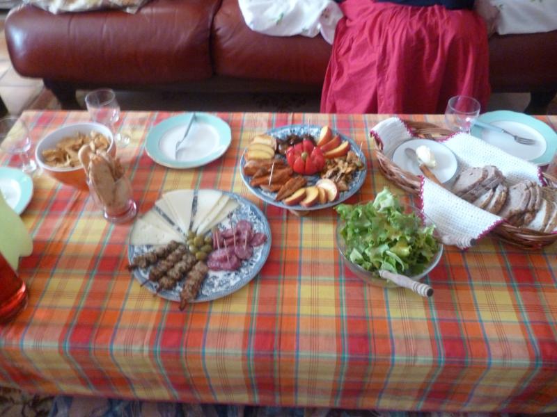 une petite table bien sympathique avec mes cousin,cousines: Le gentil cousin ne s'est pas trouvé perdu avec ses 4 femmes!!! Alors le menu: entrée- saumon et asperges vertes,terrine de st.Jacques Sauté de dinde accompagné de haricots verts et gratin de blé (d'après mcc33gourmande) fromages et savarin garni de groseilles (du jardin congelées en juin) les vins?? CHAMPAGNE en apéro, un GROLLEAU gris de Vendée et un BOURGUEIL Bonsoir et à demain pour les photos,en attendant je vous envoie des roses.