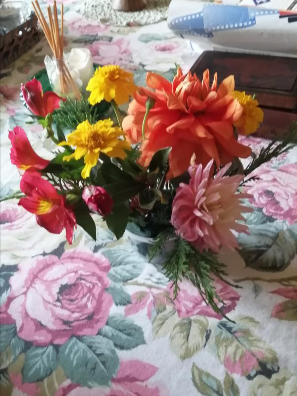 Alors,pas de promenade,ni jardinage,pas envie de rester à la maison car c'est un temps cafardeux.Puisque je n'ai pu rendre visite à mes " Mamies " hier je vais m'y rendre cet après midi.C'est toujours un plaisir pour elles d'avoir quelques nouvelles et petits "rapports" du village et parfois très enrichissant de parler du passé:des souvenirs pour les uns,des connaissances pour les autres.Et pour éclairer un peu cette journée un petit bouquet. |