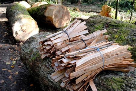 Après avoir écorcé l épicéa,benjamin fait deux entailles pour délimiter la longueur de la sangle et à l'aide d'une "cuiller",commence a lever les sangles.