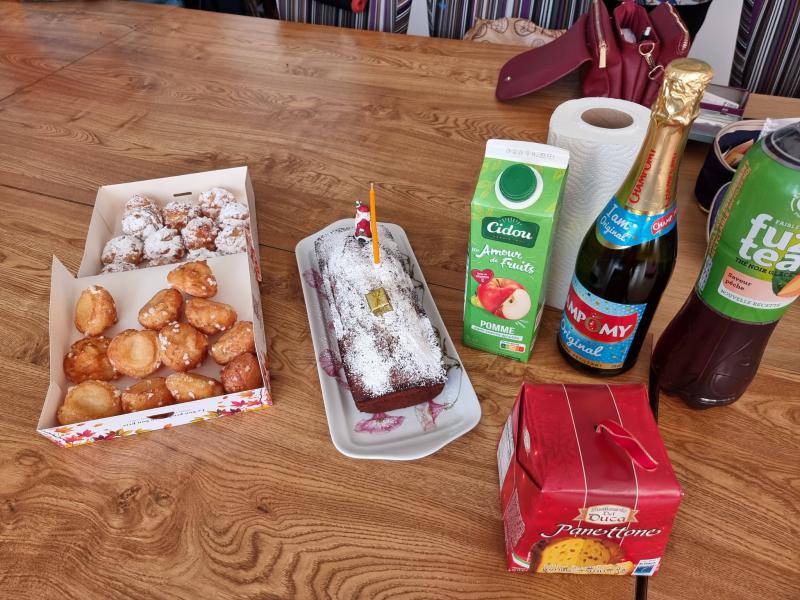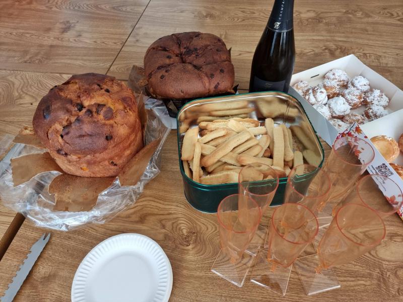 Cette année, il y avait 2 panettones, des spritz, des choux et des chouettes, du jus de pommes, des petites bulles et bien sur.....du café !