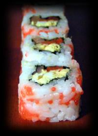 Enfermez la garniture au centre du riz en vous aidant du film plastique et serrez avec un makisu, modérément pour ne pas écraser les oeufs de lump.