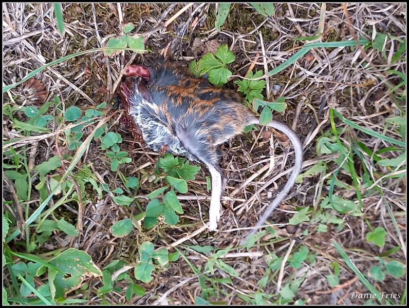 Bin voilà, un nouveau carnage au jardin,  merci les jumeaux , vous avez bien bossé, mais il y en a encore ! alors "aller aller " au boulot ! on ne change pas une équipe qui gagne ! ce n'est pas un rat taupier car la queue est différente et la couleur du pelage aussi ! mais alors c'est quoi, pas non plus une souris; je ne pense pas ! je ne vois qu'un bébé rat ! Il manque le haut de la bête ! alors pas facile de déterminer son identité ! ''Pour la reconnaissance faciale'' c'est loupé ! lol ! les empreintes des mains idem ! reste les pieds ! les fesses ! mais ...lol   trou plus ou moins gros des rats de jardin   Là, je suis désolée, encore un pauvre merle de moins.  J'essaie de protéger les oiseaux comme je peux, nourriture l'hiver, eau propre en hauteur et en toutes saisons, mais alors pouh, les jumeaux attrapent plus d'oiseaux que de vilains rats et souris. (merles, tourterelles, ramiers, hoches queue, grives musiciennes, mésanges tout y passe. Tiens j'y repense, depuis plusieurs années, je n'ai même plus la visite d' un petit moineau, disparus aussi, les chardonerets élégants, les verdiers, c'est bien triste.   |
