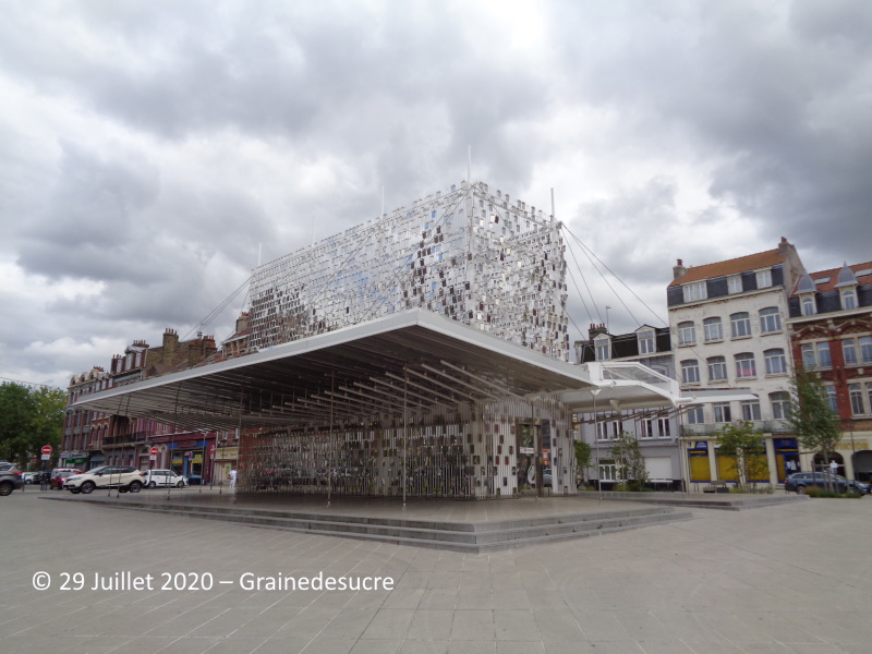 Des petits miroirs flottants,  au-dessous, le nouveau parking à vélos pour les usagers de la gare ou comment cacher artistiquement le fonctionnel...