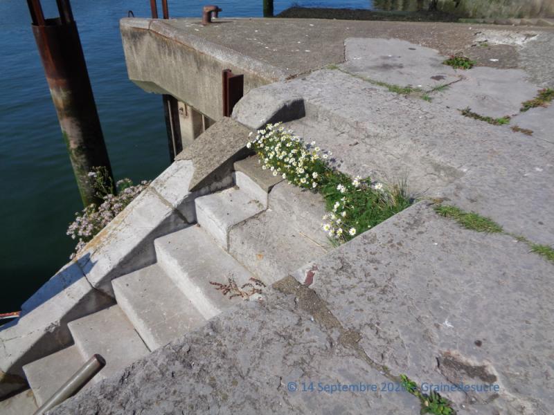 Trop joli ! ce semis de pâquerettes qui a pris possession de la première marche de l'escalier qui descend vers le bassin ! (clic sur la photo)