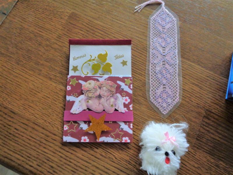 Pour ce bel envoi ! nous allions de surprises en surprises : une belle carte et un très gentil mot, un petit toutou tout doux, un marque-page magnifique en dentelle...