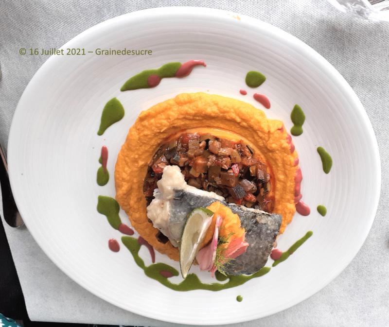 Dos de cabillaud rôti, basquaise de légumes, mousseline de patate douce au curcuma