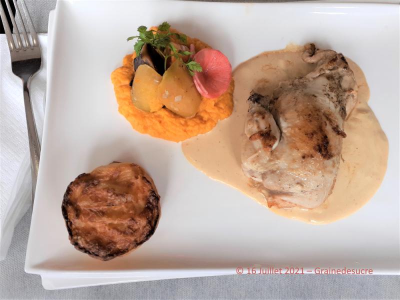 Suprême de volaille, cuisson basse température, gratin de pommes de terre, légumes printaniers, crème de foie gras
