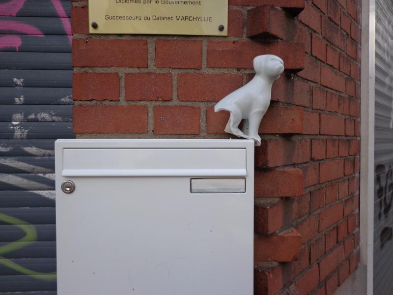 ce matin, nous passons devant cette boiîte aux lettres. Quelqu'un a déposé ce petit chien, partie d'une faïence cassée...cette boîte maintenant a du chien !