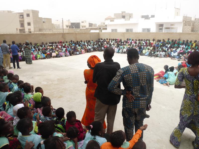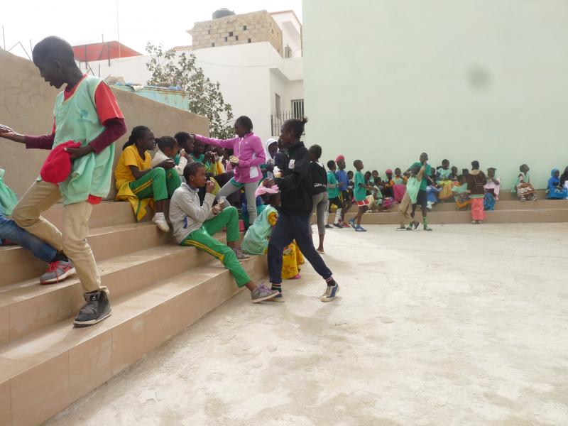 1ere réunion de tous les élèves du primaire (+ de 500) sur les gradins du nouvel espace