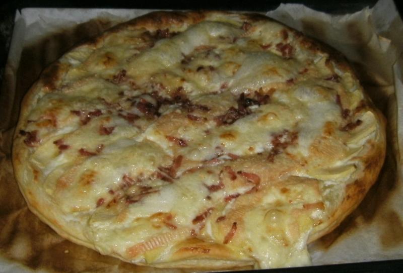 6/ Etaler dessus la crème fraîche, les lamelles de pomme, les tranches de munster et les lardons. Cuire 15 minutes.