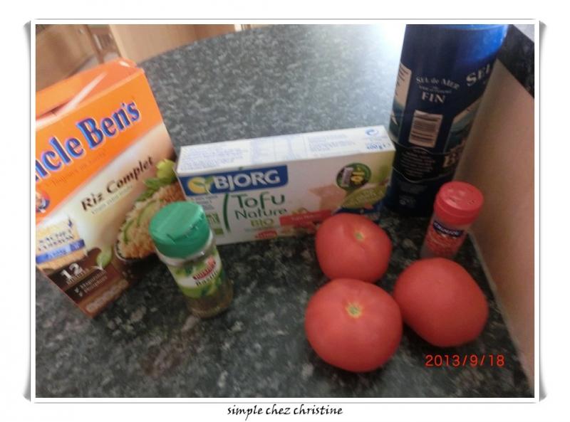 Creuser vos tomates, les évider, metter la chair des tomates dans une poele ajouter du concentré de tomates, le tofu coupé en dés, les épices, sel poivre, faire mijoter 15 mn.
