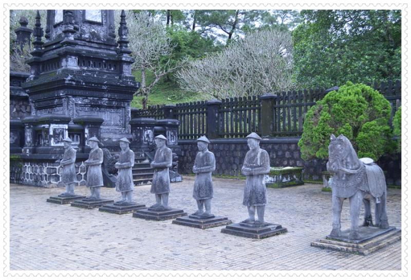 La décoration est faite avec fenêtres vitraux et céramiques mosaïques brisées en morceaux. Le tombeau de Khai Dinh est tellement complexe et avant tant de détails que l'empereur a dû acheter aux français de l'acier, du fer, ciment et carreaux. L'empereur a également envoyé des navires pour la Chine et le Japon pour obtenir des céramiques et vitraux pour son tombeau.