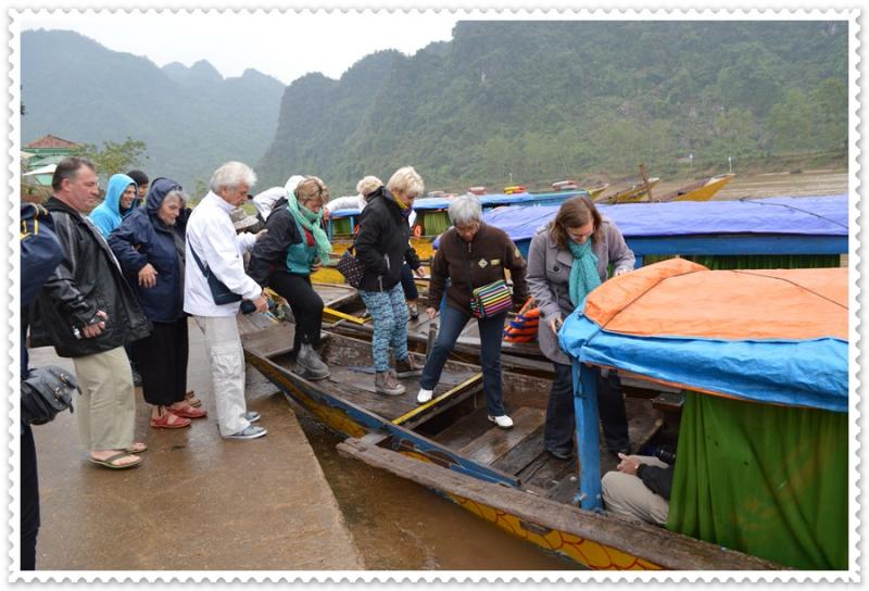 Départ pour les grottes de Phong Nha, en bateau jusqu'à l'entrée des grottes, ces bateaux sont très vetustes...sur un bras du Mékong, très boueux