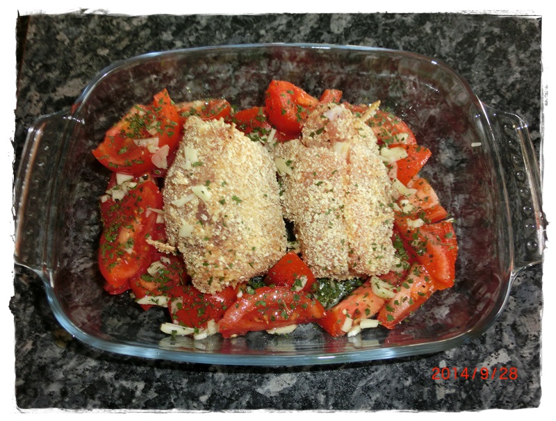 Mettre dans un plat allant au four, j'ai mis quelques tomates frâches autour avec une gousse d'ail et du persil, sel et poivre.