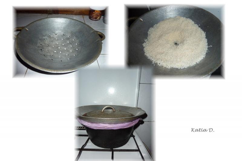 Dans une calebasse (ou un saladier) trier soigneusement le riz car on peut y trouver des petits cailloux qui font très mal aux dents. Ensuite, le laver 3 ou 4 fois à grande eau en changeant l’eau à chaque fois, jusqu’à ce que l’eau soit claire. Bien égoutter et mettre de côté.