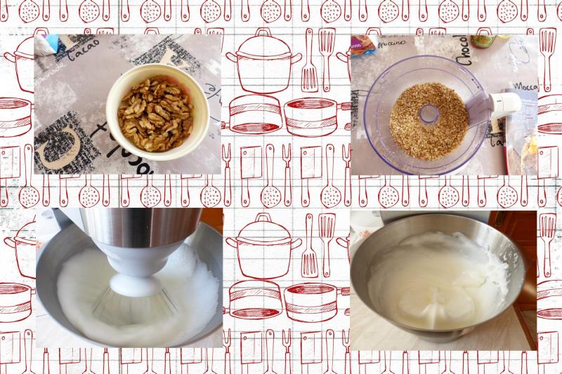 Préchauffez le four 150°.Mixez les noix, tamisez la farine avec la maïzena.Fouettez les 5 jaunes et 150 g de sucre jusqu'à ce qu'ils blanchissent et moussent.