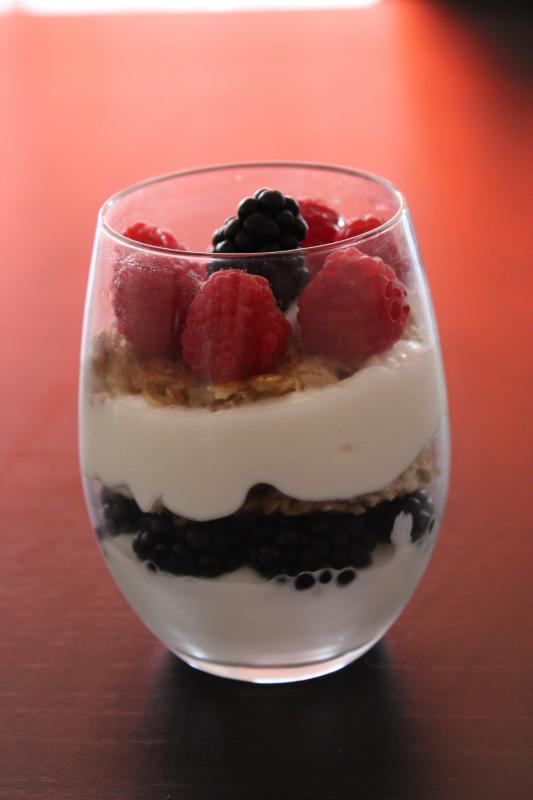 Verrine fruits rouges, blinis d'avoine et faisselle au miel |