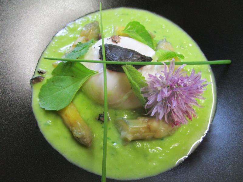 Avec ce crémeux d'asperges à l'ail noir, une note fraîche pour cette entrée de printemps parfumée a l'estragon mélisse et basilic.