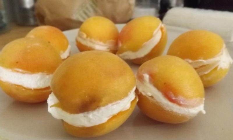 Partager en 2 vos abricots garnir une moitie avec la creme remettre dessus l autre moitie de l abricot egalisez sur tout le tour de l abricot et mettre au frais.